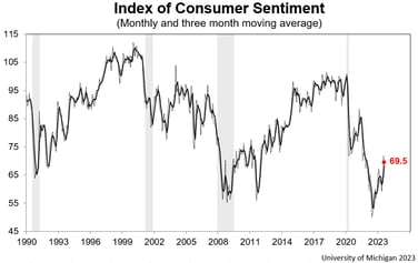 In Q2 of this year, for the first time since 2019, The American Customer Satisfaction Index, shows improved marks across the board. Customer satisfaction has done more than level off, it has increased in its largest quarterly gain since 2008. The ACSI report notes the increase is being driven by gains in industries like automobiles, appliances, and technology. Consumer sentiment is also improving. The Index of Consumer Sentiment from the University of Michigan shows a rise of 19.4% from the previous year.